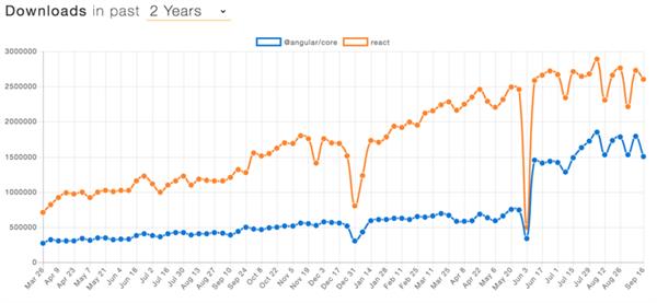 According to npmtrends.com reports, Both React and Angular growing at awesome speed but Currently React has 10,000 more downloads than Angular.