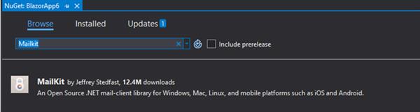 MailKit is available in the form of a NuGet package. Right-click on the ASP.NET Core project and click on - Manage NuGet packages. Search for MailKit in the Browse section. The following figure shows the relevant entry from the NuGet package manager:-