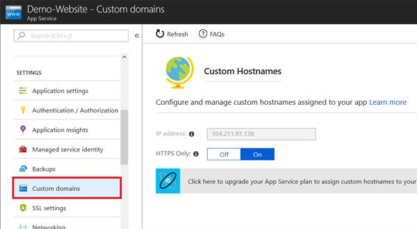 - In the Web Apps tab, click the name of your web app, select Settings, and then select Custom domains.