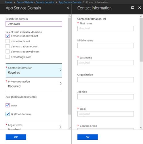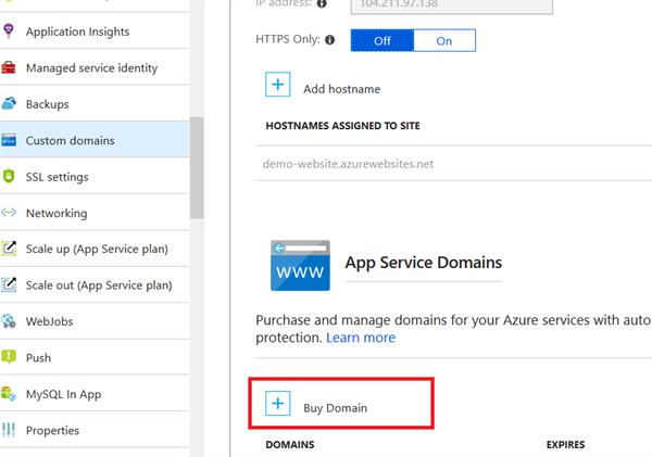 In the App Service Domain page, in the Search for domain box, type the domain name you want to buy and type Enter. The suggested available domains are shown just below the text box. Select one or more domains you want to buy.