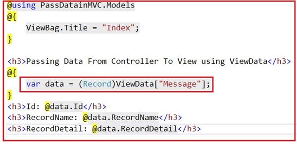 The other way of passing the data from Controller to View is ViewData. Also, a dictionary type object is similar to ViewBag. There are no huge changes in Controller and ViewData contains key-value pairs.