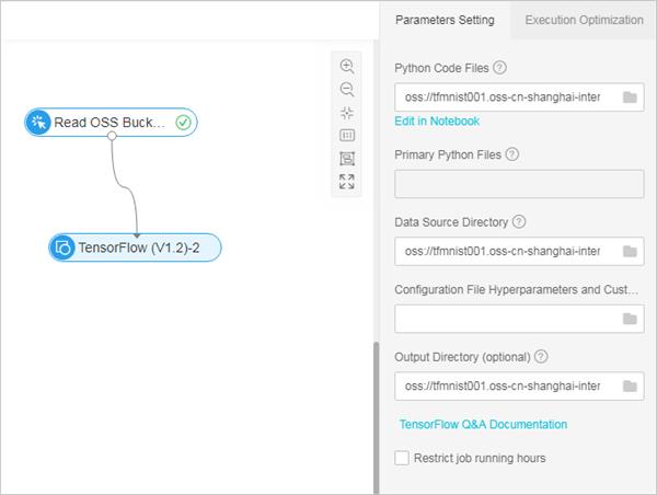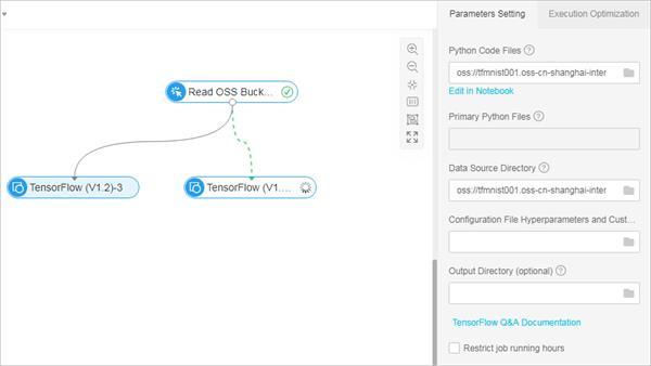 • Drag a Read OSS Bucket component and a tensor flow component to the canvas and configure Tensor Flow component as follows