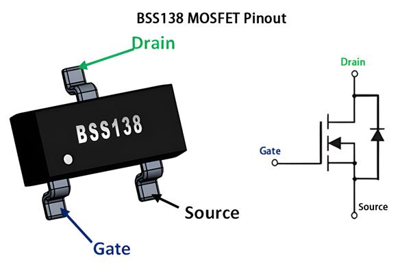 The BSS138 has three pins: Gate, Source, and Drain, each serving a specific switching function.