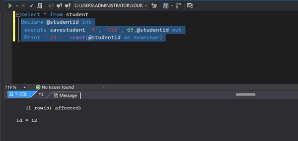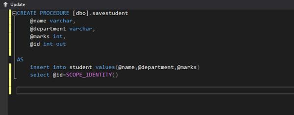 In order to understand how the process flows, we need to base it with an example. Firstly we create a stored procedure named ‘save student’ in order to insert the name, department, and marks of students in the table. The table also contains the id column consisting of the id of the students but we set it to identity so that will be automatically generated and we need not pass input for that column. We provided the stored procedure with three parameters to accept the input and an output parameter as id which will return the id of student that is newly added. We used the scope_identity() to return the last identity value inserted in the identity column in the same scope.