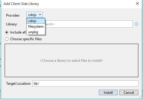 - Select Manage Client-Side Libraries from the Visual Studio Project menu.