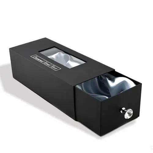 Styles vary from simple kraft boxes to fully printed luxury boxes with foil stamping and magnetic closure. Some have clear windows for a preview of the wig, while others have satin inserts or covering netting to secure the hair.