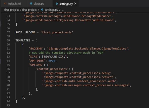 the next step is to let Django know of the templates by editing the DIR key inside of the TEMPLATES directory in the settings.py file