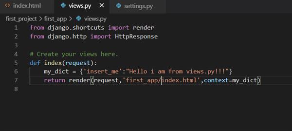 inside index() function we defined a dictionary named my_dict and there we will use the same template tag variable that we defined in our index.html