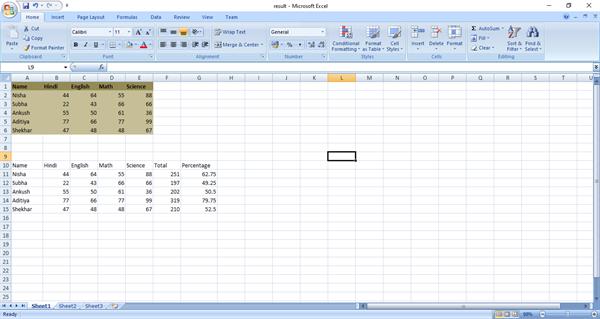Task: The aim is to calculate the total marks and percentage of students automatically.