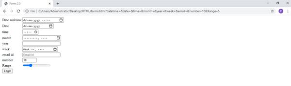A FORM is a container of various other controls like text boxes, buttons, radio buttons, etc. which contains certain kinds of information and this information is carried to the concerned destination when a submit button is clicked. FORMS 2.0 is a successor of Forms available in HTML 4. But Forms 2.0 comes with some additional features. HTML5 contains various new types for the forms which are datetime-local, date, time, week, month, year, email, range, number, and many more.