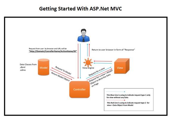 - Request that returns a view only without data from the Model so when the user requests the request handled by the MVC Handler then it is redirected to the Controller and then it I'll directly call an Action Method that is [HttpGet]. If that method returns an instance of a ViewResult then it will find the suitable view from the View Directory from the website solution and then the View Engine (ASPX/RAZOR) will render the view in HTML for the user's browser.