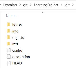 Once successfully initialized, git, will create a hidden directory in your working directory called “.git” and a new folder with your defined project name will be created. In our case, it will be “LearningProject”.