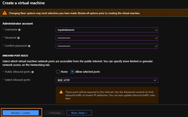 Select inbound ports RDP and HTTP to connect VM remotely.