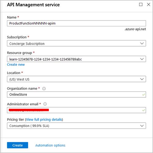 TABLE 1 Setting Value Name Use a unique name within the azure-api.net domain Subscription Concierge Resource group [sandbox resource group name] Location Choose one of the following locations that support the Consumption Plan: West US, North Central US, West Europe, North Europe, Southeast Asia, Australia East Organization name OnlineStore Administrator email Use the default value Pricing tier Consumption