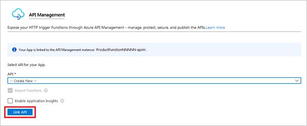 Choose to Create to create the API Management instance, which may take several minutes, then select Link API.