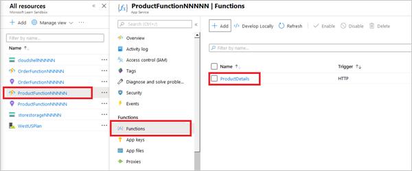 Choose the App Service whose name begins with ProductFunction. The Function of Apps UI for this app opens in the portal.