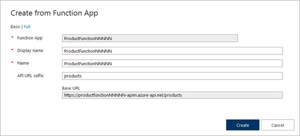 In the Create from Function App page, change API URL suffix to products and select Create. The API is now created for the ProductDetails function.