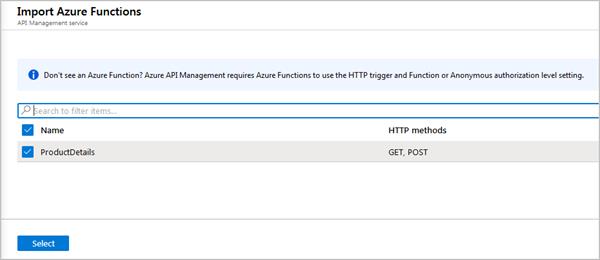 The Import Azure Functions dialog opens with the ProductDetails function highlighted. Choose Select to continue.