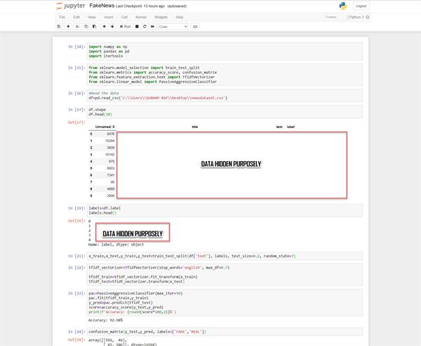 from sklearn.model_selection import train_test_split from sklearn.metrics import accuracy_score, confusion_matrix from sklearn.feature_extraction.text import TfidfVectorizer from sklearn.linear_model import PassiveAggressiveClassifier - Read the data from the dataset