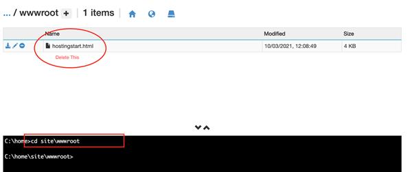 Now, move into site >> WWWRoot folder by running the “ cd site/wwwroot” command in the CMD section and delete the default “Hostingstart.html” file.