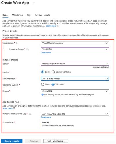 Now, we’ll go in Azure Portal and create an Azure app service for hosting this local Angular Grid Sample with Ignite UI, so follow the below steps: