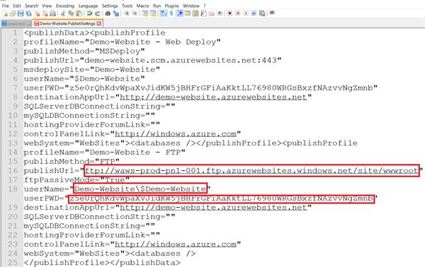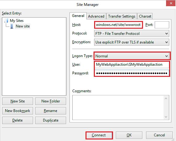 - User: Paste the userName obtained from the publish settings file above in Notepad. Password: Paste the userPWD obtained from the publish settings file above in Notepad.