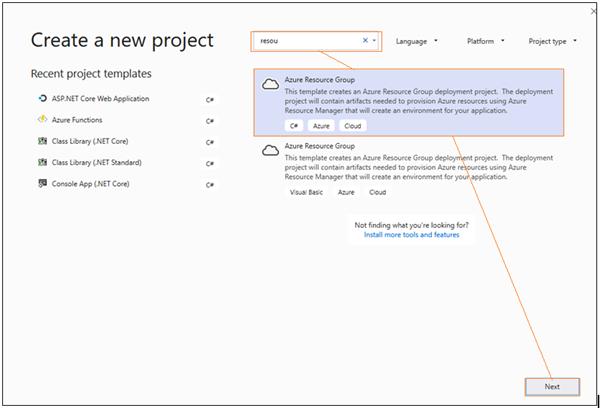 Step2. Search for Azure Resource Group, you will get two projects both are same but language are different one is in c# and the other one is in Visual Basic. So select with c# and click on the Next button.