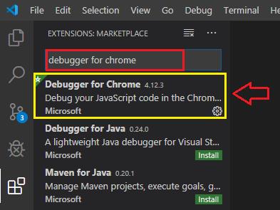 Write “debugger for chrome” in the search box and I hope you’ll get the same list as the following image select first one and click on the install option in the details page at the right side.