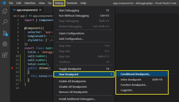 Or you can find the debug option from the top menu of the VS code and select the debugging breakpoint options that suit your requirement.