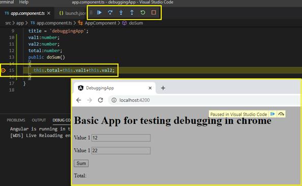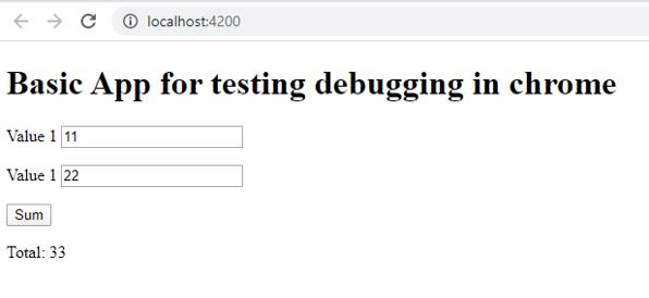 I changed the default app.component.html with the following code, this will create a UI with two textboxes just for an example to add (sum) two values with doSum() function in App.component.ts so that I can put a breakpoint to test the debugging.