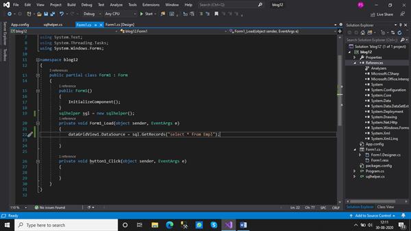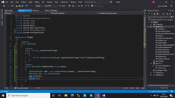 We developed a method ‘GetRecords()’ in the SQL helper class which takes the SQL query as a parameter. And this method returns the dataTable after executing the SQL query from the database.