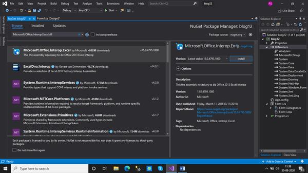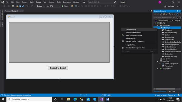 STEP 2: Right-click on the ‘References’ in the Solution Explorer to add the dll Microsoft.Office.Interop.Excel into the existing form. This assembly enables interoperability between Excel and C#. It enables creating/reading Excel files from a C# application.