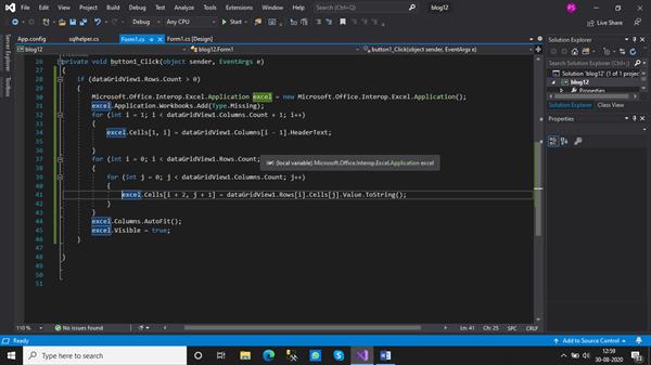 STEP 8: Now we write the code for the button clicking on which the data table would be exported to the excel sheet. We make the instance of the Microsoft.Office.Interop.Excel.Application to access the objects. The Add() method takes the type of template of the workbook as a parameter. We run loops for setting the heading in the excel sheet which comes from the column name of the data table. The second loop adds values to the corresponding cell in the excel sheet. These values come from the rows of the datagridview.
