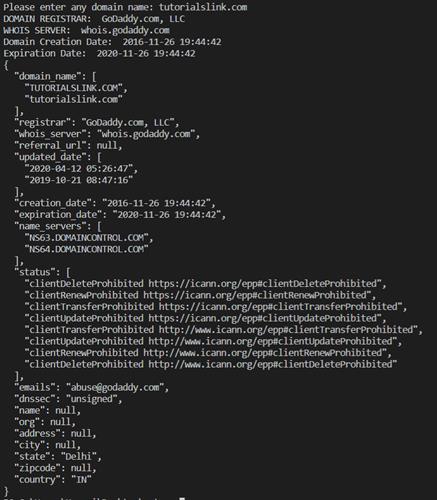 registrar, creation date, expiration date, and more in Python.