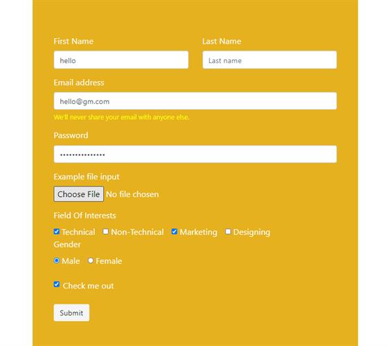The elements of the form are wrapped inside the form tag. Inside the form tag, there can be rows and columns too, to create a grid inside it. The other elements are usually inside the .form-group classes which act as parent class and inside this there can be other classes too, nested. These classes occupy several classes to carry of functionality to take input from the users in the input sections. These inputs can be mail id, name, password, and more. There are type attributes to perform checkboxes and radio buttons inside the form.