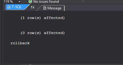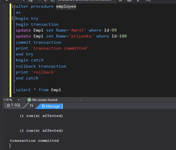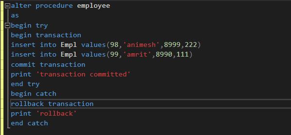 We put the SQL statements in a try block and finally committed the transaction. This way if an error occurs, then the control moves to the catch block and the transaction would be rolled back instead of executing a few of the statements which might have made changes to the database. We even added print statements to verify if the commit and rollback commands work well. Now we finally execute the stored procedure.