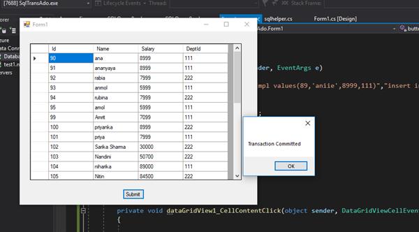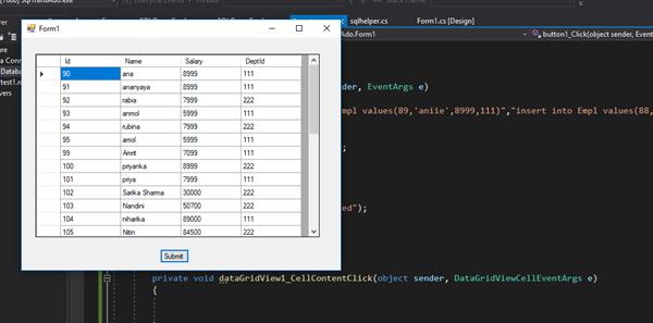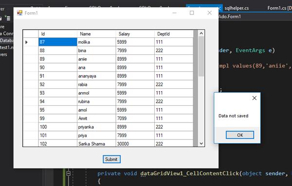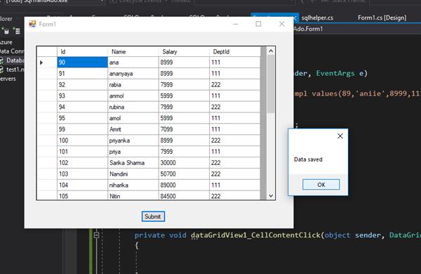 In the above code, we passed three queries and if the result variable has a value greater than 3 then a message box appears stating that the data is saved otherwise data not saved. In the end, we pass the DataTable object as the data source to the data grid view so that the table contents are visible as soon as the form loads.