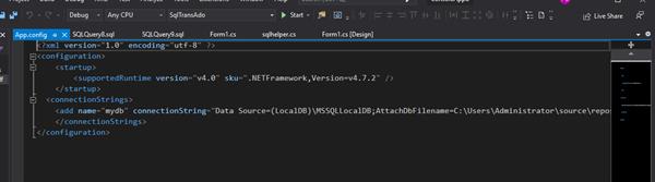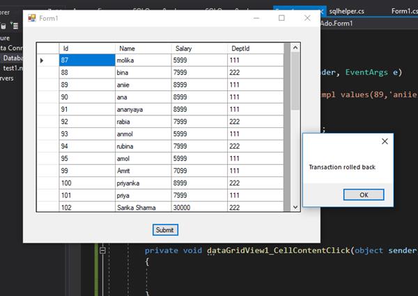 In the above code, we first created a property named ‘_Connectionstring’ to read the connection string in the Application Configuration file. Then we created a method named RunDml which takes multiple queries as parameters. In this method, we created the objects of SqlConnection, SqlCommand, and SqlTransaction classes. We inserted the remaining code in the try block because if an exception occurs it could be handled by the catch block which will undo the changes made to the database. On the other hand, if no exception occurs the transaction is committed in the try block to make the changes permanent. Finally block is added at last which is always executed no matter an exception occurs or not. In this block, the connection is closed. Because it is a good practice to open the connection as late as possible and close it as early as possible.