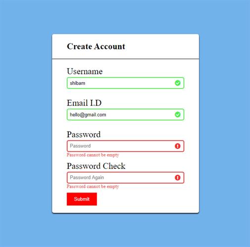 Make sure to build up to four form divisions ( i.e., Username, Email I.D, Password and Check Password ) with suitable classes and id tags to make it feasible for styling and selecting in JavaScript.