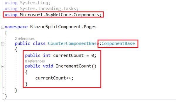 As this is going to be a separate file so first thing, we need to inherit this call from “ComponentBase” and this class will be available from “using Microsoft.AspNetCore.Components” so don’t miss this in your using statements. Now, our CounterComponentBase class has capabilities to override all the Component’s life cycle events that we will use much time in our application.