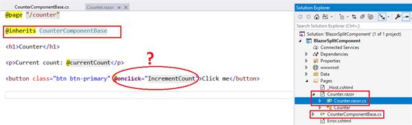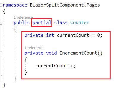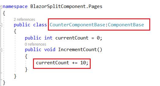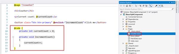 Here in this file, I have highlighted the C# logic part that will be executed on the counter button click. Now, we’ll use the same component and will split its code into a separate .cs file