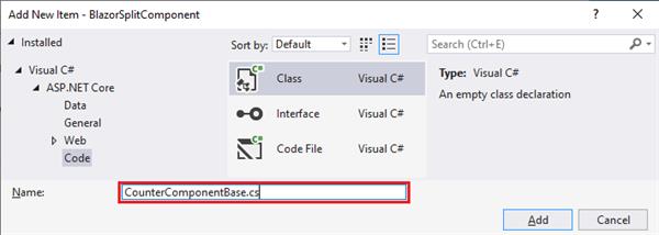 First, add a class in the same “Page” folder using the same name of the component with a recommended postfix ComponentBase.cs.