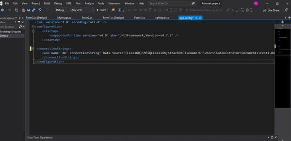 STEP 3: As we require our application to maintain connectivity with the database, we add the connection string in the app.config file. We can find the app.config file in the solution explorer. The app.config file represents the application configuration file. Connection string represents the path or the location where the database is actually present.