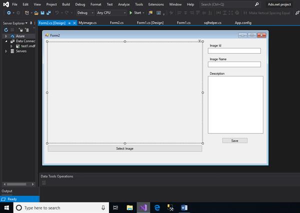We added a number of controls from the toolbox. Toolbox could be found from the ‘View’ option appearing in the topmost menu bar. We dragged and dropped buttons, textboxes, and a picture box. Three text boxes are added to take the input from the user in the form of image Id, image Name, and description. Two buttons are added to select images and to save the image respectively. The picture box plays a significant role in the application as the selected image appears inside it.
