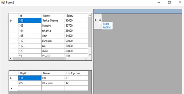 Now in order to view the tables in the dataset, we provide the datasource to datagridview control on the form. Since dataset contains a collection of tables, we need to pass the name of the table or the index as an argument along the dataset object integrated with the Tables property. Instead of Datagridview control, we can even use the Datagrid control. Datagrid is very much similar to the datagridview. The only difference is that it contains a navigation bar to navigate to the various datatables present in a dataset. Due to this feature, while passing the datasource to the datagrid we only use the dataset object. Therefore, we need not mention the ‘Tables’ property with the name or index. We also use the DataRelation class to represent the relationship between the two datatables.