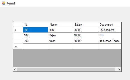 dt.Rows.Add(101, "Ruhi", 25000, "Development");