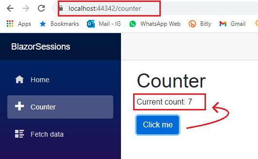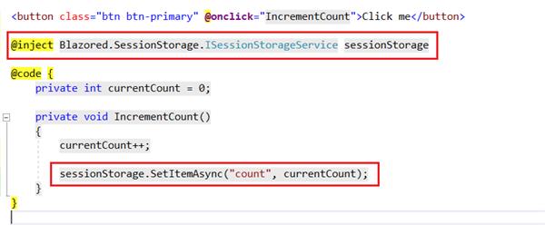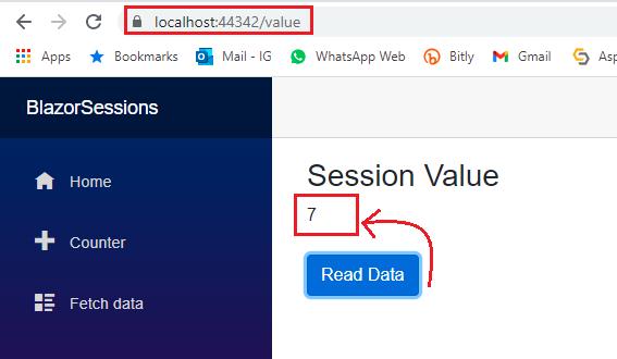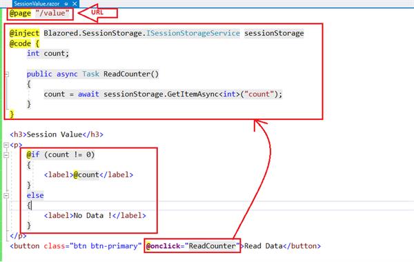 In my sample I have added one more component “SessionValue.razor” with routing value as “/value” and I have added an HTML button in my page DOM to call the function which will read the “count” value from session storage service.