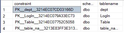 select distinct constraint_name as [constraint], table_schema as [schema], table_name as [tablename] from INFORMATION_SCHEMA.KEY_COLUMN_USAGE