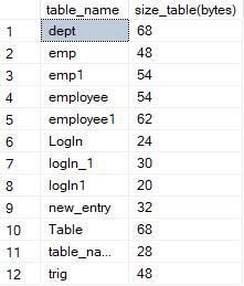 select sob.name as table_name, sum(sys.length ) as [size_table(bytes)] from sysobjects sob, syscolumns sys where sob.xtype = 'U' and sys.id = sob.id group by sob.name