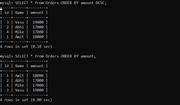ORDER BY- Order by is used to sort the result in ascending or descending order. By default Order by sorts in ascending order. To sort the result in descending order we have to use the DESC keyword.